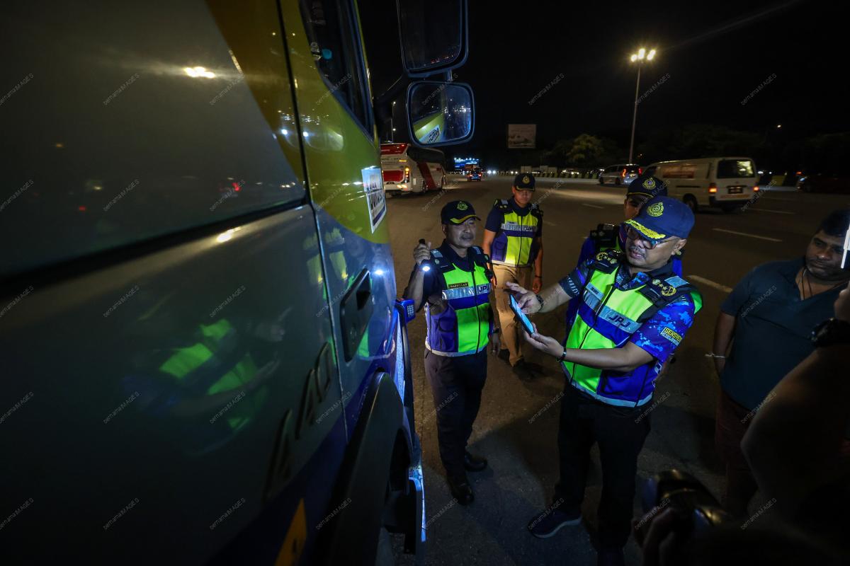 BUKIT MERTAJAM, 6 Okt -- Pengarah Jabatan Pengangkutan Jalan (JPJ) Pulau Pinang Zulkifly Ismail (kanan) membuat pemeriksaan penguatkuasaan Peranti Had Kelajuan (SLD) ketika melakukan operasi khas di Plaza Tol Juru malam tadi.Sebanyak 165 kenderaan perdagangan termasuk bas persiaran dan ekspres diperiksa sejak 1 Okt lalu dalam penguatkuasaan Peranti Had Kelajuan (SLD) secara berperingkat.Daripada jumlah itu, 91 kenderaan dikenakan tindakan dan diberikan Notis 114 Akta Pengangkutan Jalan 1987, manakala 31 kenderaan mempunyai slip SLD semasa diperiksa. -- fotoBERNAMA (2025) HAK CIPTA TERPELIHARA